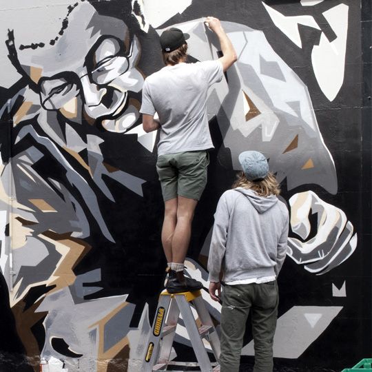 M: We were involved in the launch of Grill’d’s new flagship store on Flinders Lane earlier this year. This was an awesome job for us because we got to collaborate with a great bunch of people at Grill’d and Techne Architecture and Design to create a mural based on the Melbourne laneways (Melbourne has heaps of laneways). It reaches 6m in height. It was hectic working on site with all of the building trades but we loved drinking V’s at 6 in the morning and reading Zoo Magazine with the tradies.