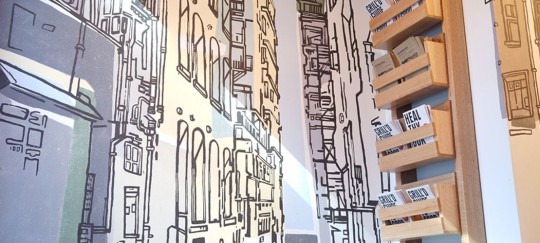 J: This is a tricky question to answer because our style evolves to suit the job at hand. It’s always changing. Our work can range from clean and simple computer generated graphics to hand drawn illustration to large, colourful painted wall murals. Maddison and I work on our own artwork on the side, but when we approach each new job, we always try to remain as neutral as possible and to not let our personal styles have a big influence.